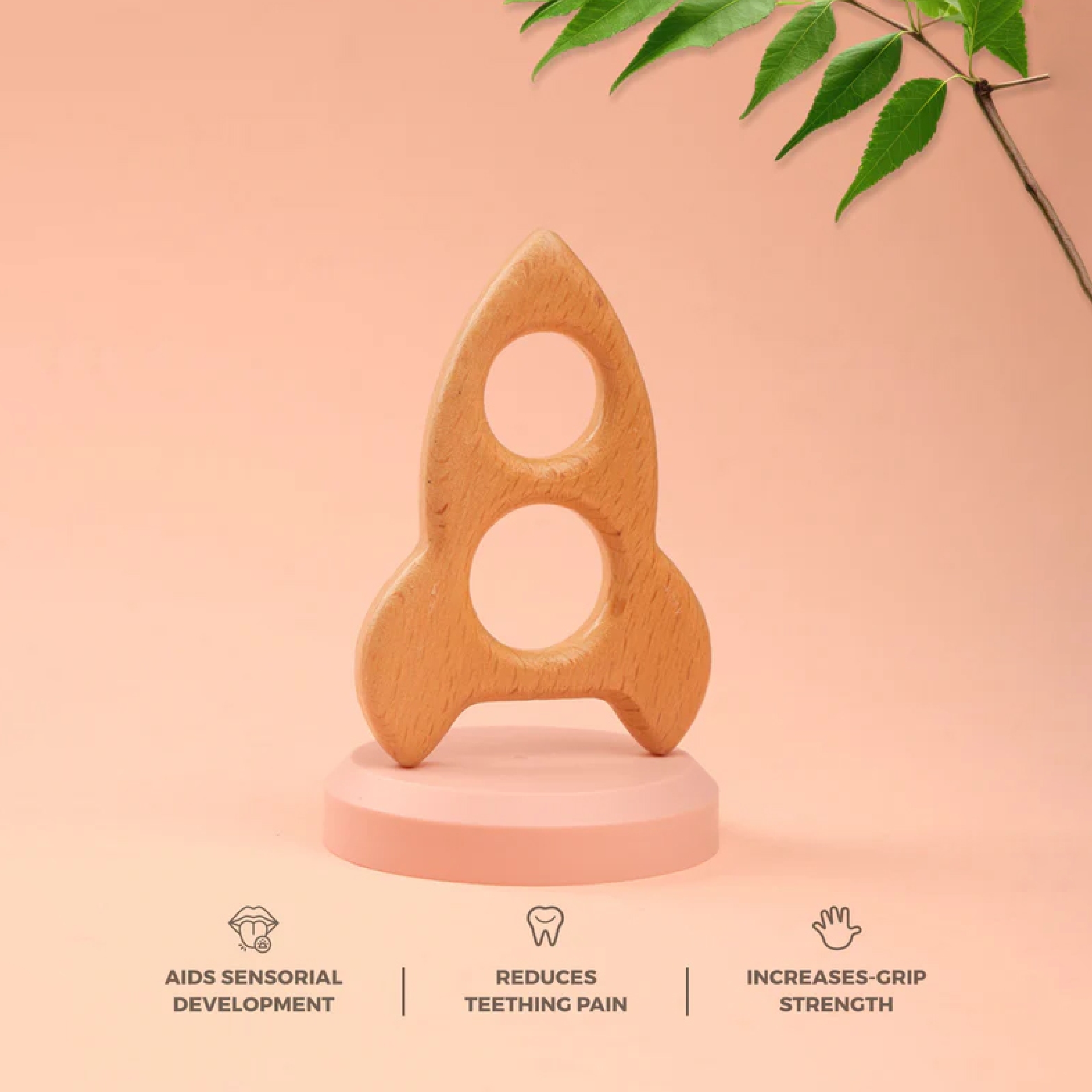 The rocket-inspired design stimulates curiosity, while the dual finger holes support easy holding and better grip. Smooth edges ensure gentle contact with delicate gums, making it suitable for everyday use. This Montessori-inspired toy also promotes fine motor skills, hand-eye coordination, and sensory exploration.
