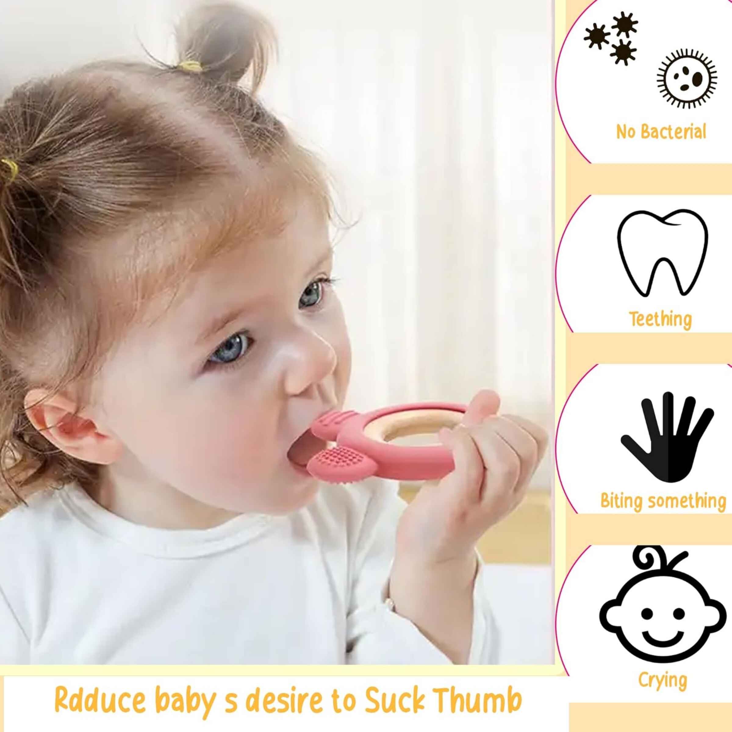 Made from food-grade silicone and natural wood, this teether is completely safe, non-toxic, and eco-friendly—perfect for everyday use by infants.
